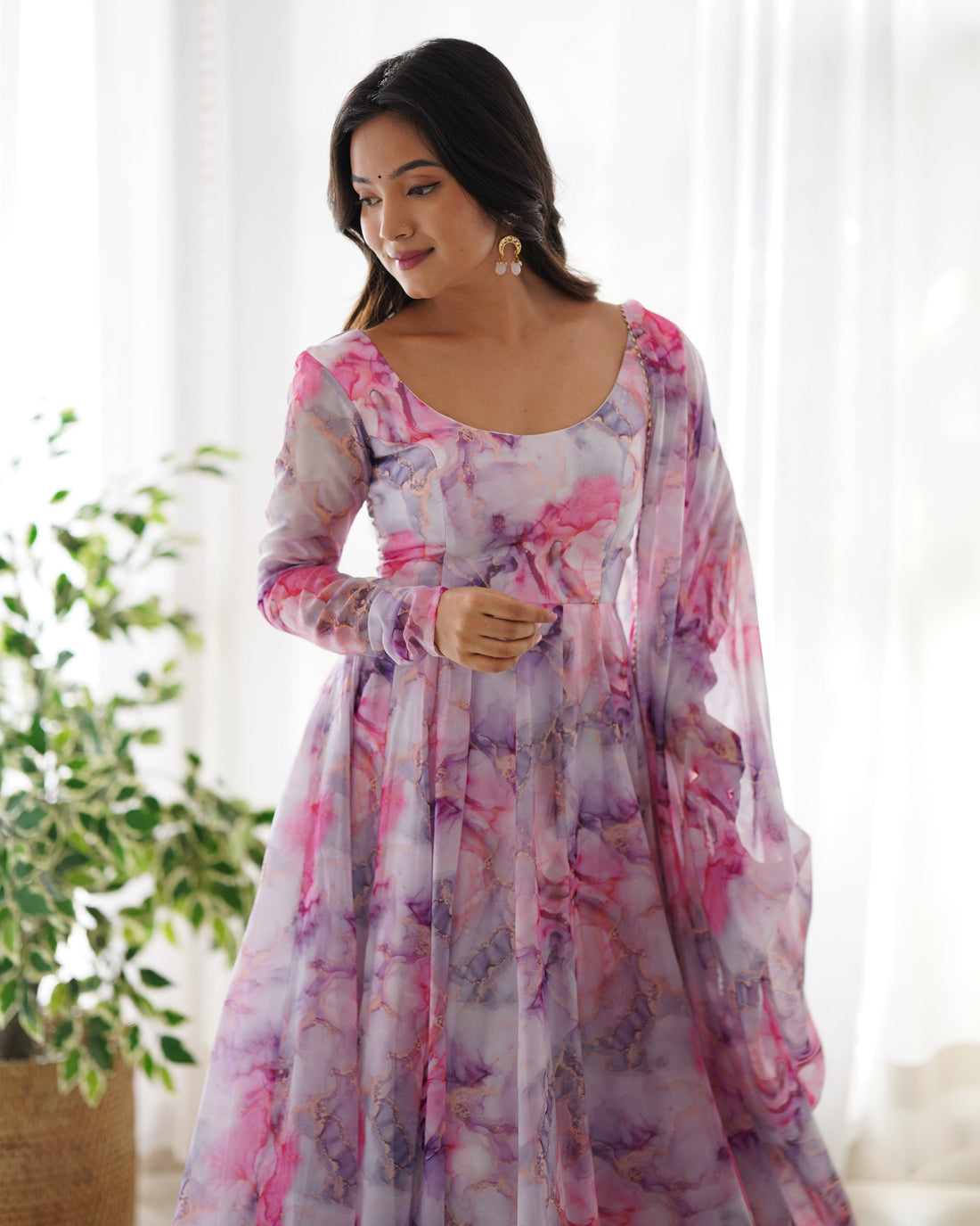 The Kali cut style pure soft organza silk Anarkali three-piece full-stitched suit combines elegance and...