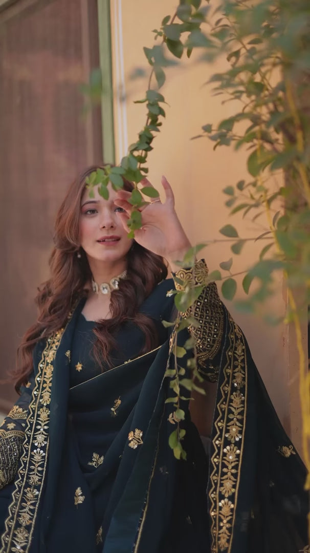 • Fabric: Faux Blooming Georgette with Zari & Sequins Embroidery