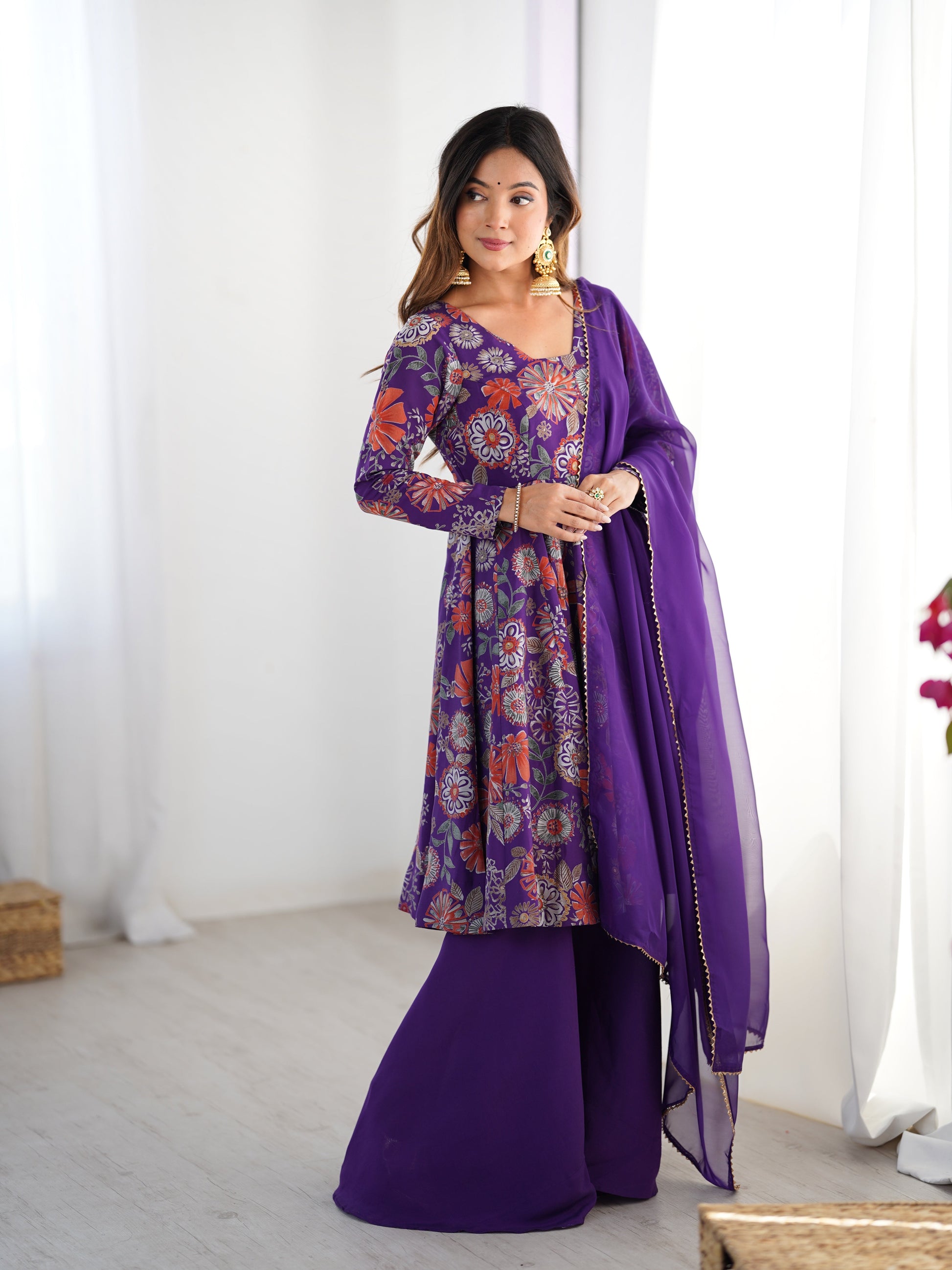 Purple Color Heavy Pure Roman Silk Kediya Kurta Set with Plazzo And Dupatta Set