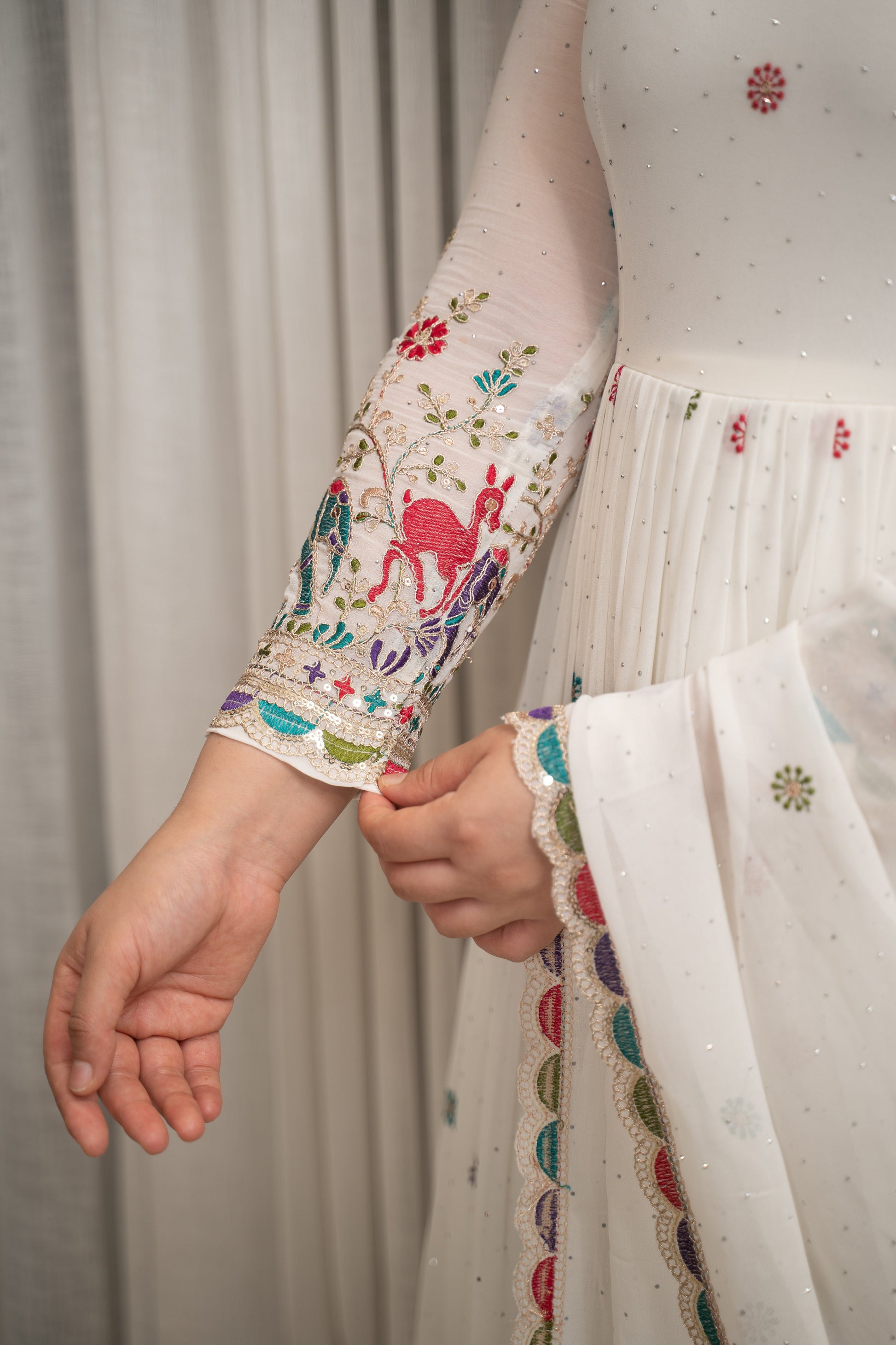 Drape yourself in elegance with this stunning white Anarkali suit crafted in premium Fox Georgette. Adorned with intricate sequin and embroidery work, this outfit is designed to make you shine at every celebration.